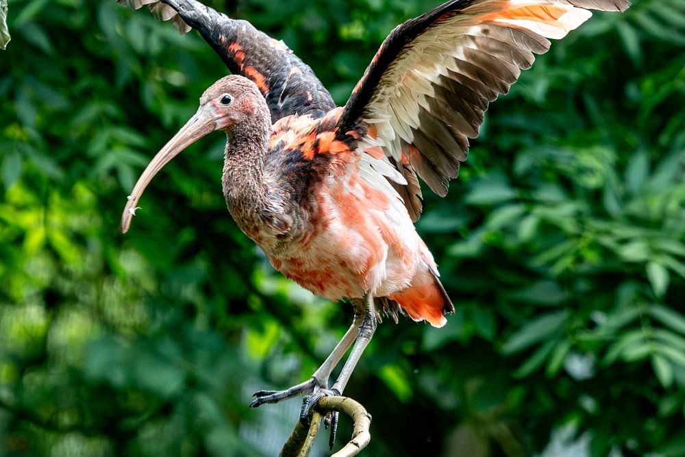 Ibis rouge immature ouvrant les ailes