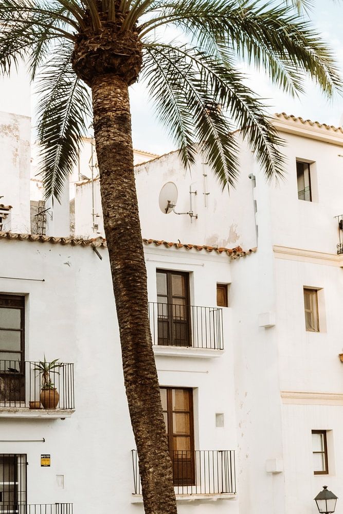 Vous aimez une atmosphère ensoleillée et méditerranéenne dans votre maison ? Alors cette photo est pour vous. Avec un grand palmier au premier plan et les appartements blancs en arrière-plan, vous entrez vraiment dans l'esprit espagnol. Cette photo a été prise lors d'une promenade matinale dans la vieille ville d'Ibiza.