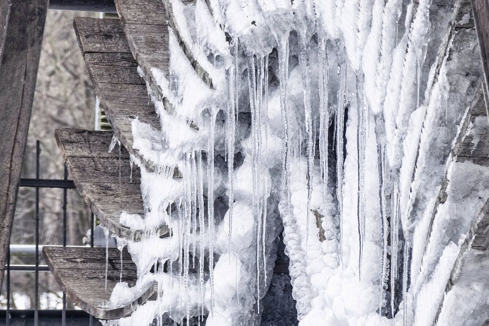 Winterimpression, hiver, gel, glacial, froid, vieux moulin, roue de moulin, hiver, noir et blanc