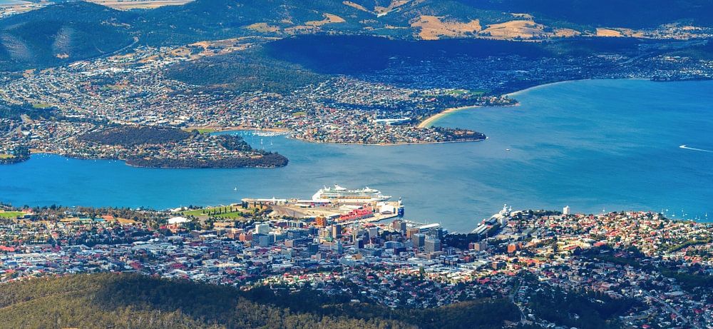 Vue aérienne panoramique de la ville de Hobart et de ses environs depuis le sommet du Mont Wellington. Île de Tasmanie, Australie.
