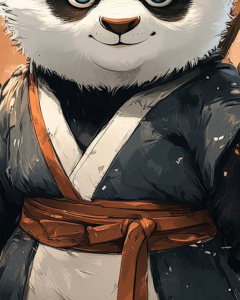 Cette illustration numérique représente un panda de dessin animé vêtu d'une tenue d'arts martiaux. Le panda a un visage blanc avec des oreilles et des yeux noirs, et un doux sourire. Il porte un gi bleu foncé avec une sous-couche blanche et une ceinture marron. Deux bâtons de bambou sont attachés à son dos. L'arrière-plan est beige clair avec des éclaboussures d'orange et de noir, ce qui donne une impression artistique et dynamique.