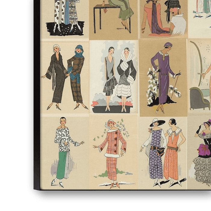 Le grand format de cette œuvre d'art en renforce l'impact visuel, mettant pleinement en valeur les motifs détaillés et les couleurs subtiles. Le format mosaïque confère à l'œuvre un effet dynamique et stratifié, chaque illustration racontant un pan de l'histoire de l'âge d'or de la mode parisienne. Cette œuvre n'est pas seulement un hommage à l'histoire de la mode, mais aussi une déclaration de style pour les intérieurs modernes.