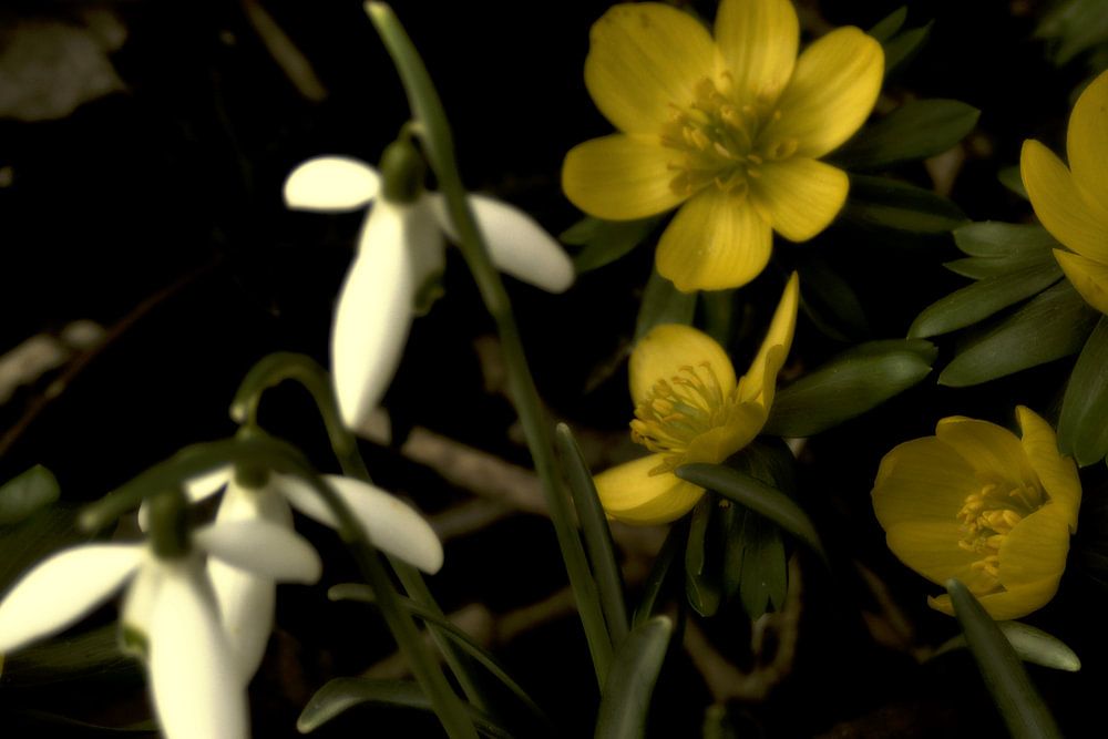 Image de la fenêtre, la nuit de printemps, Regardant nuit, regarder à travers, Winterling, perce-neige, flore, fleurs, jaune, blanc, fleurs, fleurs jaunes, fleur blanche, fleurs de ressort, vue de la fenêtre, l'écran de la fenêtre, ressort, saisons, fleur de printemps, l'éveil du printemps