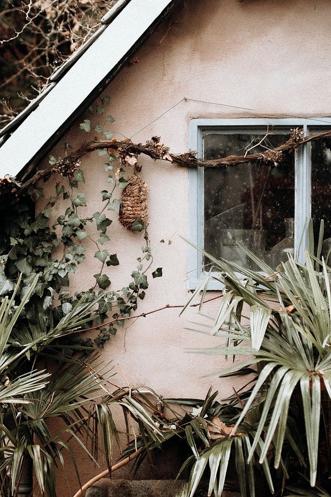 Un coin accueillant devant la maison avec des plantes vertes et de belles couleurs. Ensemble, ils forment une belle palette de couleurs pastel.