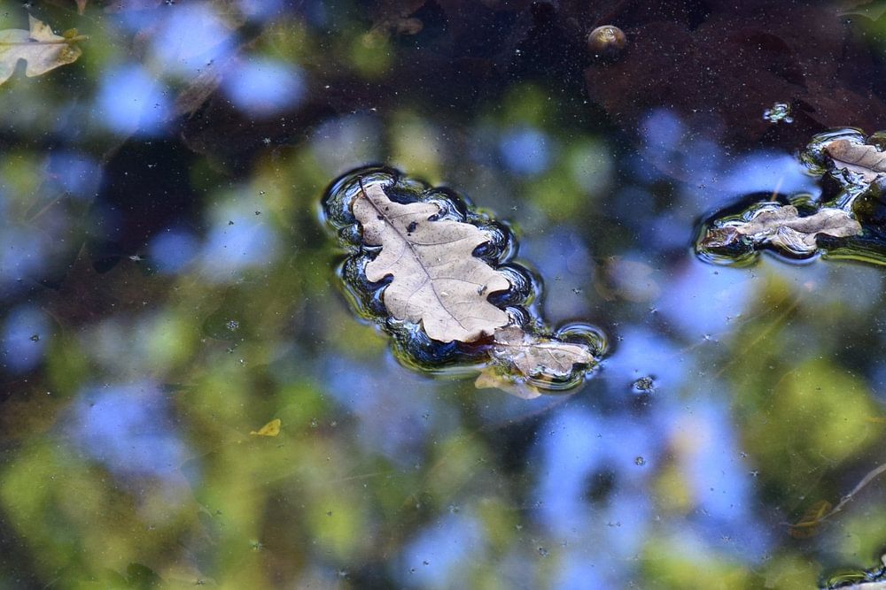 Les magnifiques chênes avaient laissé tomber leurs feuilles sur l'eau et on peut voir les feuilles jaunes des hêtres et le ciel bleu se refléter dans l'eau.