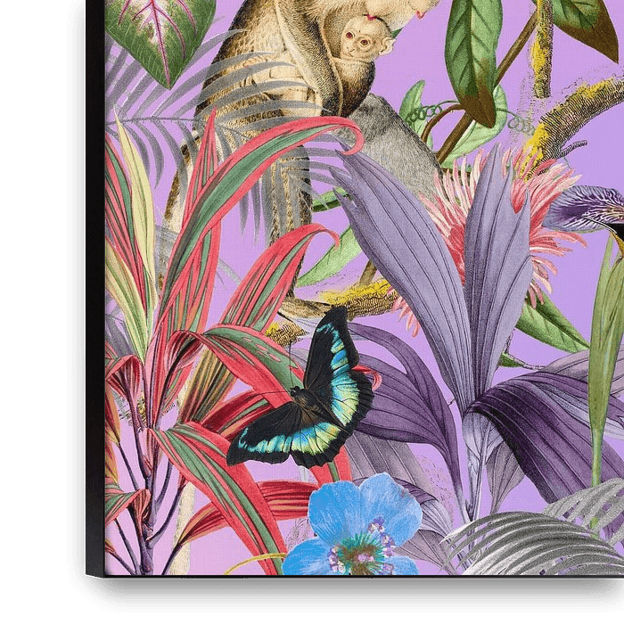 Une jungle tropicale peuplée de singes, de papillons, de colibris, de fleurs et de plantes.