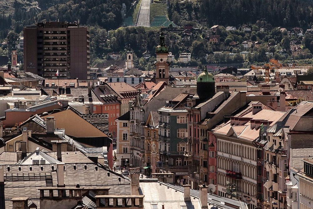 Panorama sur les toits de la ville tyrolienne d'Innsbruck, avec le tremplin de saut à ski en arrière-plan.