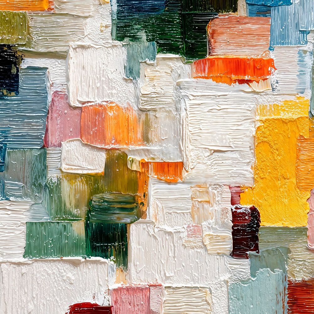 Une peinture impressionniste abstraite composée d'une mosaïque vivante de coups de pinceau rectangulaires et carrés aux couleurs variées ; la composition associe des tons pastel doux à des couleurs vives et intenses. La texture crée une impression de profondeur et de mouvement ; l'atmosphère générale est vivante et dynamique et rappelle…