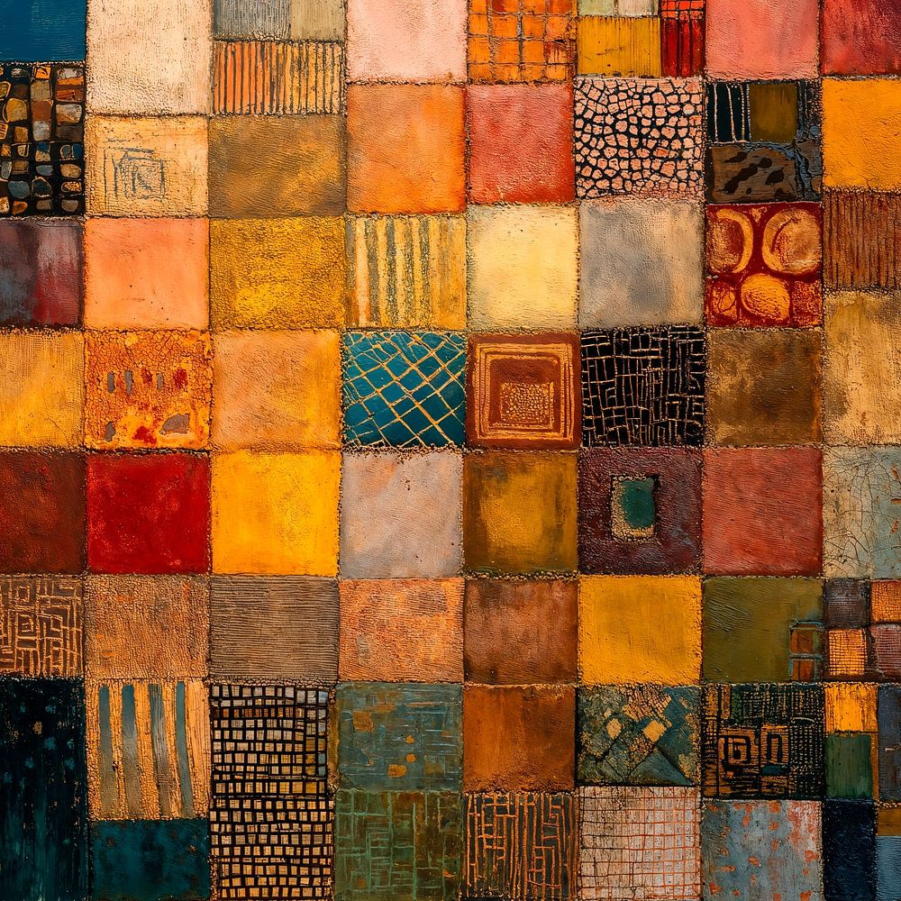 Une œuvre d'art abstraite en mosaïque avec une structure en forme de grille qui est rompue par les dimensions et les couleurs irrégulières des morceaux individuels, chaque morceau ayant une texture unique avec des motifs et des lignes. La composition est visuellement attrayante, attirant le regard sur la surface complexe. Stylisée dans…