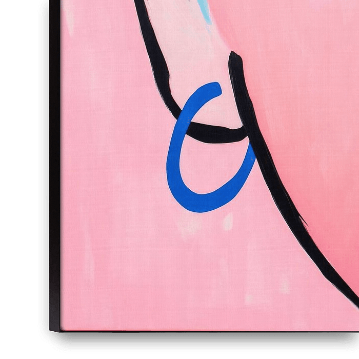 L'image montre un portrait fascinant avec un grand œil bleu expressif qui contraste vivement avec les traits du visage aux couleurs pastel. On remarque les cils noirs épais et les aplats de couleurs géométriques roses et jaunes qui confèrent à l'œuvre une touche moderne et artistique. La tristesse supposée est renforcée par le dégradé…