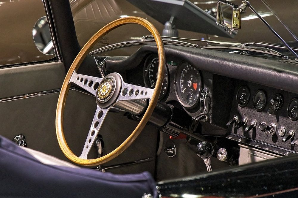 Tableau de bord avec volant d'une Jaguar Type E Cabriolet.