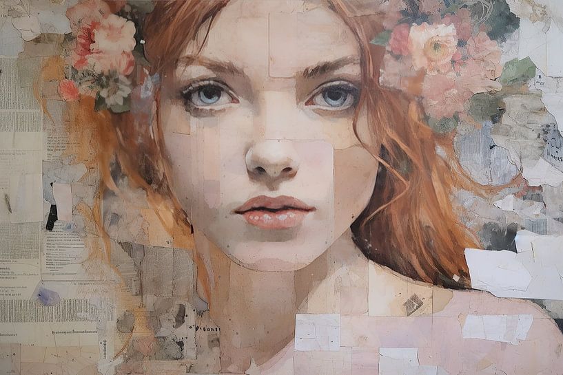 Portrait de Jade - peinture abstraite / mixed media art peint. Joli contraste entre un portrait sophistiqué et une technique de collage/peinture brute.