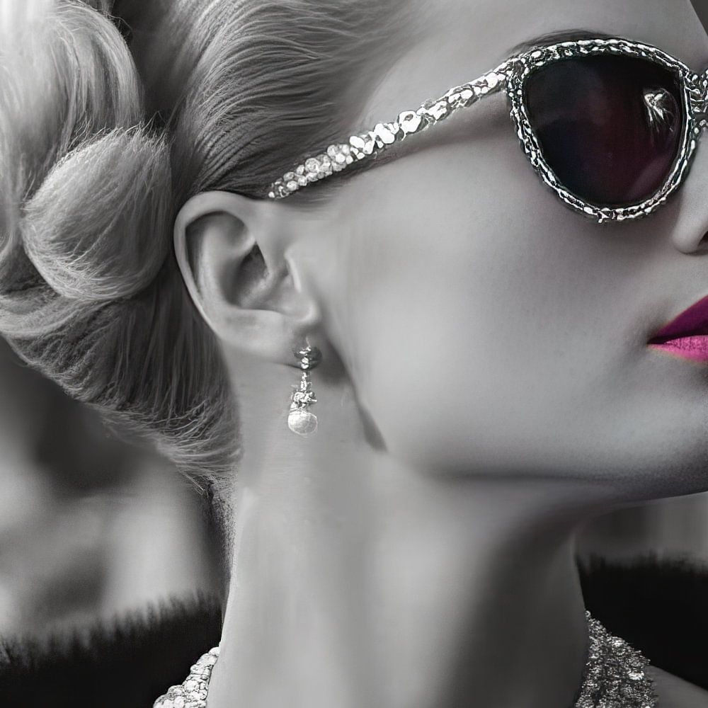 Le subtil reflet rouge clair des lèvres de Jane crée un magnifique contraste avec l'arrière-plan monochrome, faisant ressortir son sourire engageant et son expression charmante. Ses bijoux en diamants, dont des boucles d'oreilles étincelantes et un collier éblouissant, exhalent le luxe et la sophistication à l'état pur, mettant en valeur son apparence aristocratique, tandis que des vêtements soigneusement sélectionnés soulignent son sens de la mode et sa capacité à porter sans effort les tendances les plus sophistiquées. Cet impressionnant portrait de Jane reflète la gloire des années 1960 et l'élégance classique typique de cette période. Sa mondanité et sa beauté intemporelle sont mises en valeur avec brio, faisant de ce portrait un hommage durable à la mode et à la sophistication d'une époque révolue.
