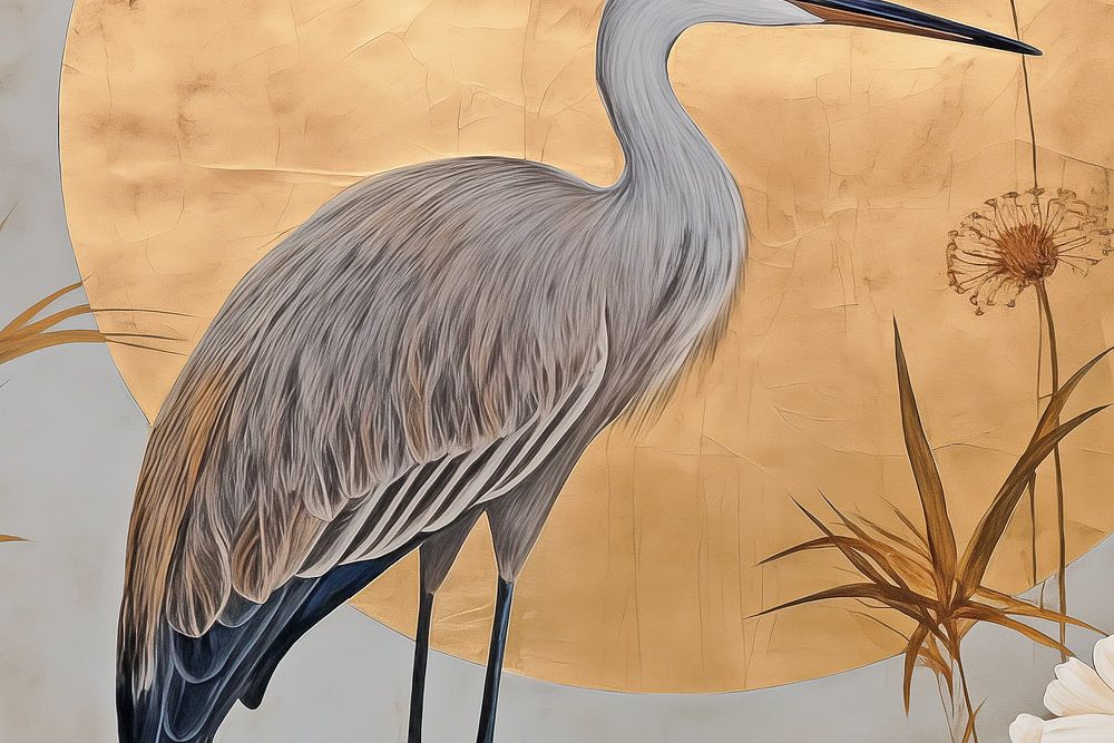 Gracieux et gracieux. La grue / héron pourpre sur ses hautes pattes dans l'eau. Impression botanique représentant la merveilleuse grue au clair de lune doré.
