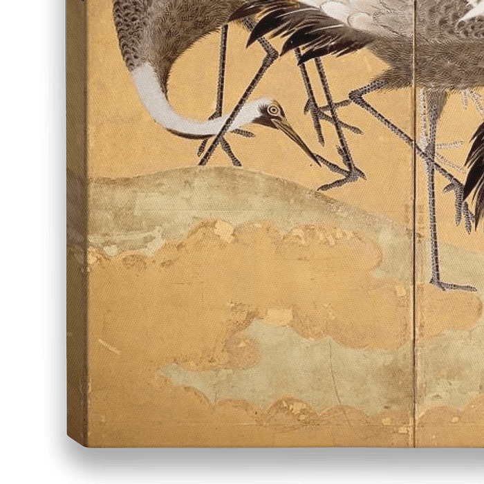 Un paysage de grues japonaises peint sur un fond élégant de feuilles d'or dans un format panoramique très apprécié.