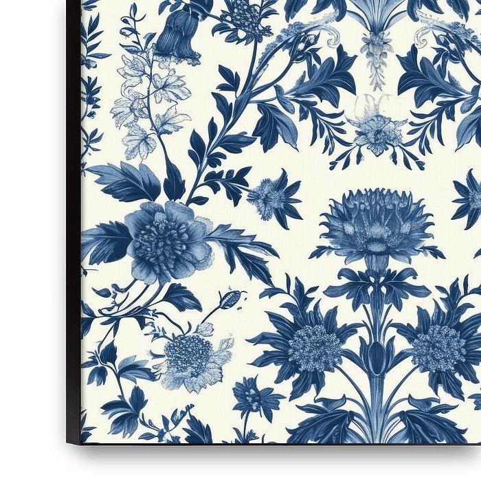 Cette charmante œuvre d'art est un rendu détaillé d'un motif de papier peint botanique classique, réalisé dans différentes nuances de bleu sur un fond blanc.