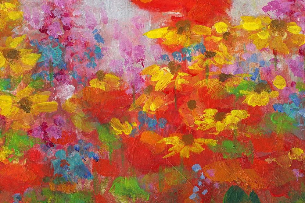 Jardin de fleurs multicolore est une peinture acrylique au format paysage peinte à la main par l'artiste Karen Kaspar. Dans un parterre de fleurs s'épanouit une grande variété de fleurs aux couleurs vives, dans des tons riches de rouge, de jaune et de violet. Des fleurs comme le coquelicot rouge, les rudbeckias jaunes, les lupins roses, les campanules bleues et bien d'autres poussent côte à côte dans une harmonie colorée et se complètent les unes les autres avec leurs couleurs vives. La verdure luxuriante et les fleurs variées créent une atmosphère vivante et joyeuse.