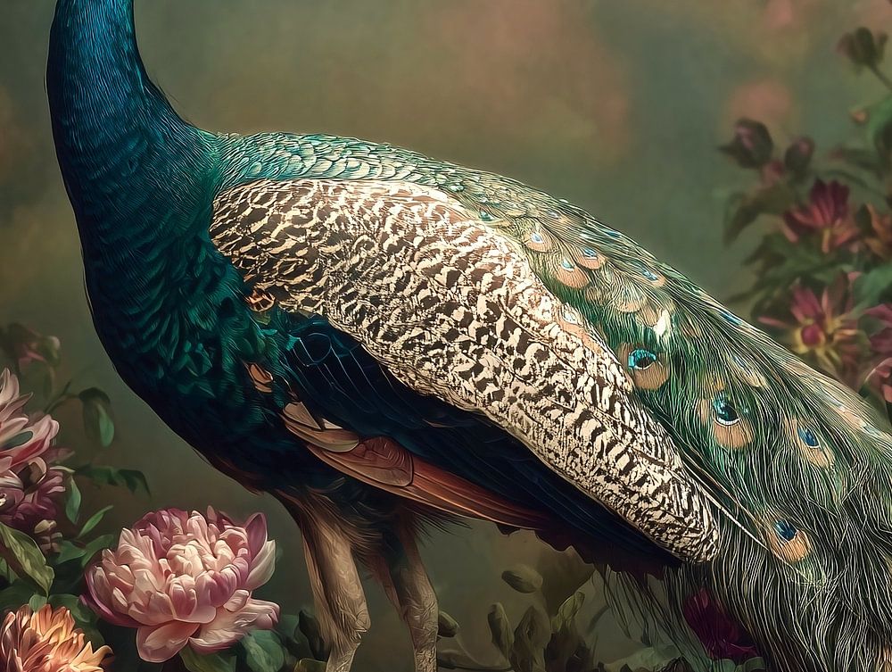 Le paon brille avec ses plumes bleu-vert irisées et sa pose élégante, tandis que les fleurs l'enlacent dans une composition pleine de couleurs, de détails et d'harmonie. Le fond doux dans les tons naturels de vert crée une atmosphère sereine, conférant à l'ensemble de l'image à la fois tranquillité et dynamisme.