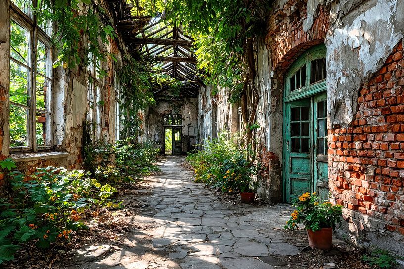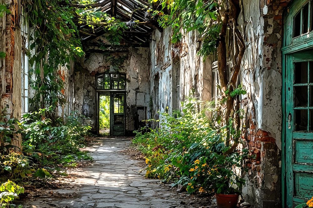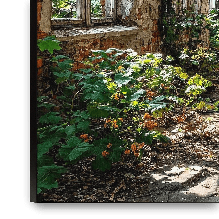 Entre les murs qui s'effritent et les fenêtres brisées, la nature reconquiert son espace. "Jardin oublié" montre un lieu abandonné où la lumière, la verdure et l'architecture se fondent en un décor silencieux et poétique.