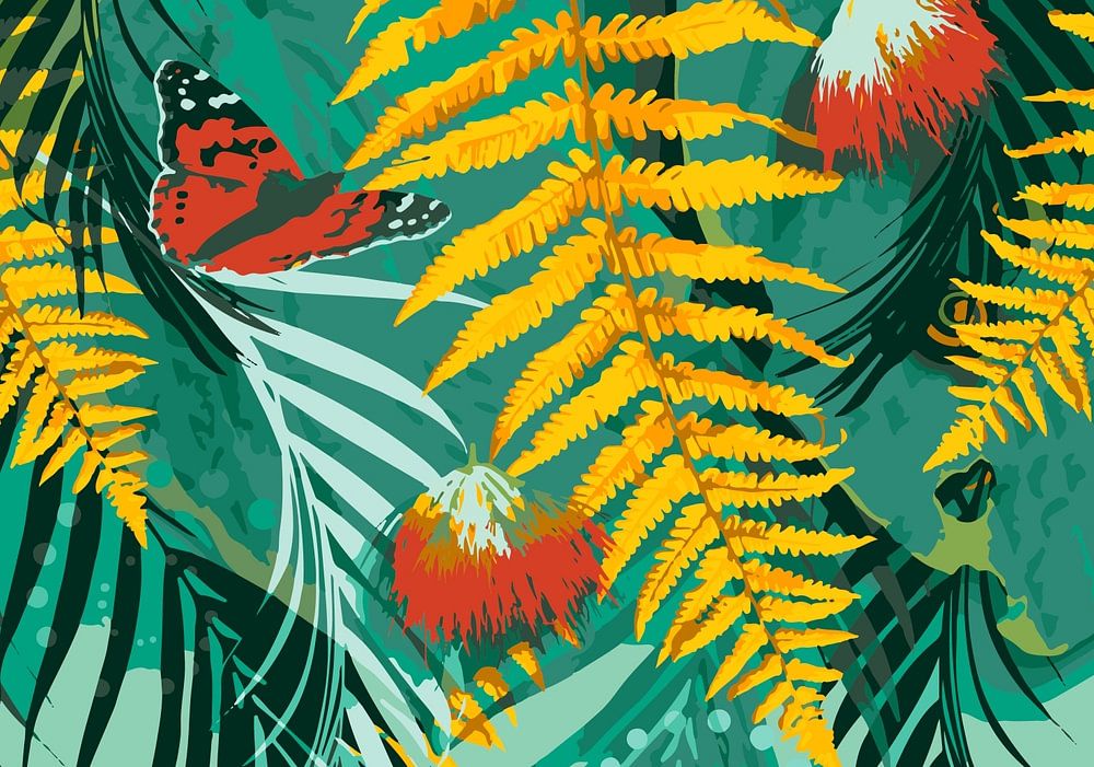 Feuilles suspendues avec des fleurs et un papillon. Les symboles font référence au nombre d'or.