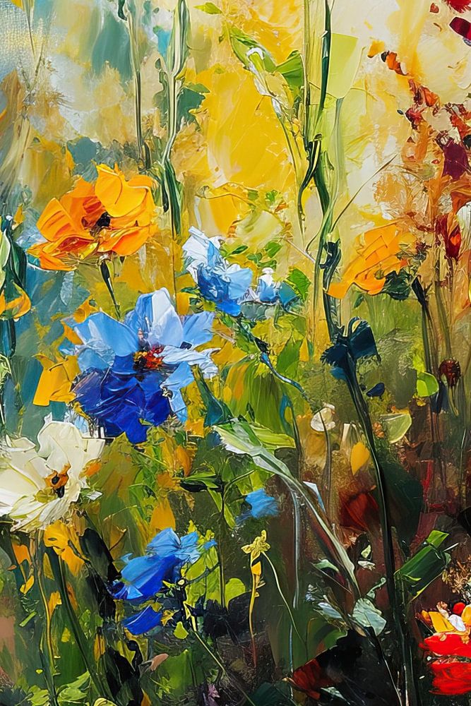 Jardin vibrant | Fleurs abstraites - Cette œuvre vibrante brille par son style impressionniste abstrait, le bouquet de fleurs colorées sautant presque de la toile. La superposition et la texture de la peinture ajoutent de la profondeur, tandis que la palette de couleurs des bleus, des rouges, des jaunes et des verts apporte une fraîcheur presque tangible.