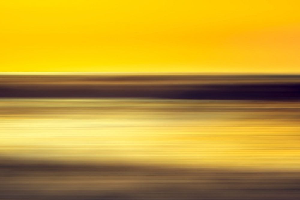 Un mélange serein de teintes jaunes et or crée une représentation abstraite apaisante d'un horizon au-dessus de l'eau. Les lignes horizontales donnent une impression de mouvement et de tranquillité. Photographie abstraite côtière.