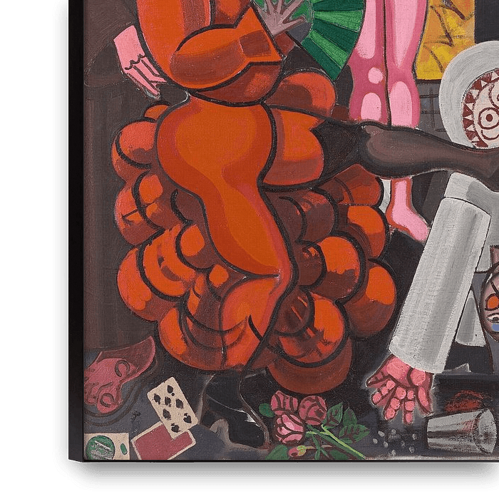 Bien que Jean Brusselmans soit souvent associé au silence et à la tranquillité, il a également peint des scènes représentant plusieurs personnages. Son approche reste toutefois toujours axée sur la forme et maîtrisée. Dans cette scène de carnaval, on ne voit pas de festivités légères, mais un groupe compact de personnages qui se tiennent presque comme des poupées de bois dans le plan. Les masques et les visages sont simplifiés en formes anguleuses, avec des contours puissants et des aplats de couleur. Le rouge, le noir et le rose créent une tension, mais les couleurs restent ancrées dans une composition rigoureuse. Le mouvement n'est pas créé par des coups de pinceau lâches, mais par le rythme et la répétition des formes. Le carnaval prend ainsi une connotation ambiguë : à la fois fête et aliénation. Brusselmans représente les personnes comme des volumes dans une construction picturale. L'œuvre souligne sa capacité à intégrer des figures humaines dans le même ordre monumental qui caractérise également ses paysages.