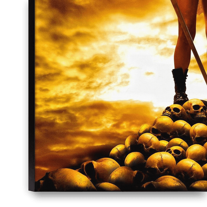 Une jeune femme, une épée à la main, se tient courageuse et forte sur les vestiges de ce qui semble être une bataille.