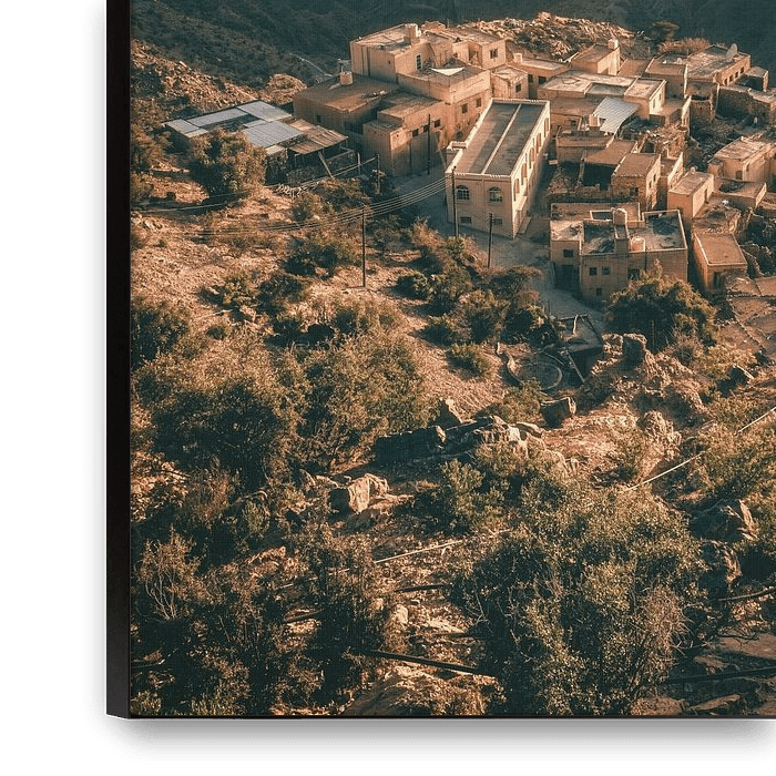 Magnifique atmosphère de soirée au-dessus d'un petit village de montagne dans les montagnes du Jebel Akhdar, au nord-ouest d'Oman.