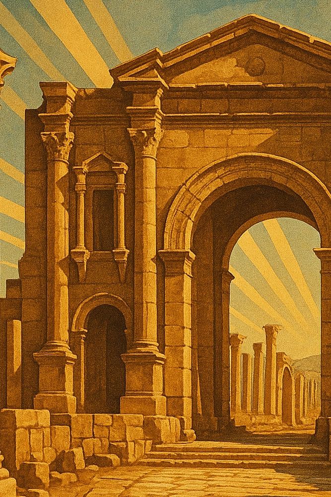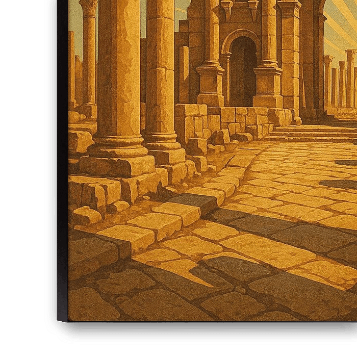 Remontez le temps jusqu'à l'apogée de l'Empire romain avec cette majestueuse illustration de Jerash, en Jordanie. Surnommée la "Pompéi de l'Orient", Jerash est ici célébrée à travers ses colonnes corinthiennes emblématiques et l'arc monumental d'Hadrien. L'œuvre d'art présente une palette de couleurs chaudes et dorées, mettant en valeur…