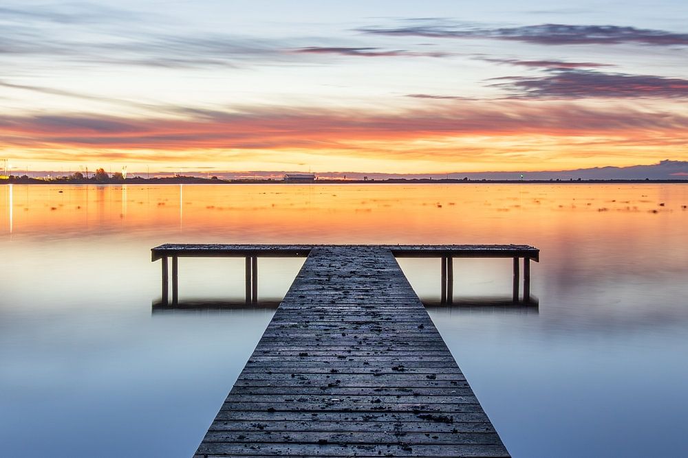 L'eau du Zuiderhaven de Den Oever, sur l'IJsselmeer, agit comme un miroir. Le soleil annonce son arrivée en colorant l'horizon d'orange, tandis que l'étoile présente rappelle encore la nuit.