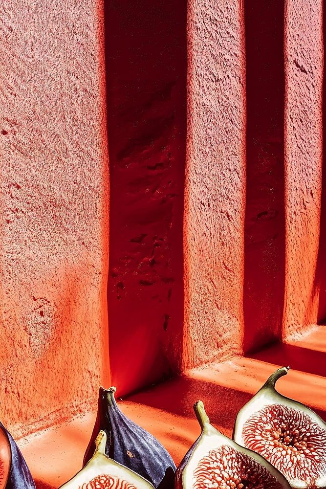Cette nature morte intrigante représente des figues dans un jeu d’ombre et de lumière sur des éléments architecturaux d’un rouge intense. Les figues coupées révèlent leur intérieur juteux, contrastant avec leur peau violette. Les rayons lumineux du soleil créent des ombres nettes qui accentuent la texture des murs et des fruits. La composition évoque la chaleur et le mystère, les figues reposant comme des joyaux dans un paysage abstrait. L'image vous invite à explorer les frontières entre nature et architecture, résultant en une expérience visuelle et sensorielle stimulante.