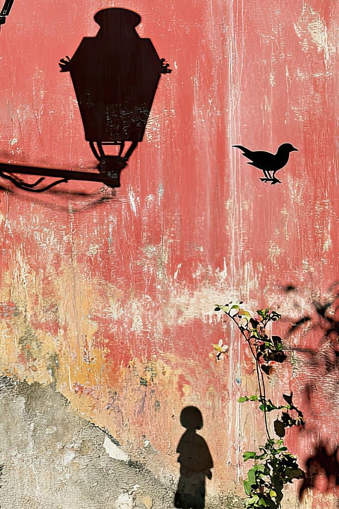 Mots clés : art de l'ombre, mur usé par le temps, atmosphère vintage, photographie urbaine, ombre de lanterne, silhouette d'enfant, photo poétique, style urbex, ombre et lumière, décoration murale créative