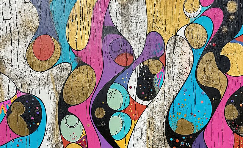 Vivid Scales Play - Cette peinture abstraite montre une multitude de formes vibrantes et sinueuses serpentant sur un fond craquelé, apparemment usé par le temps. Ces formes sont richement remplies d'une palette de couleurs frappantes : turquoise, rose, violet, jaune et noir, enrichies de touches d'or et de blanc. Le plus frappant, ce sont les lignes fluides qui se chevauchent dans un motif ludique mais complexe, créant un ensemble dynamique et harmonieux. Plusieurs structures circulaires et ovales, intégrées dans les formes organiques, ont une texture qui rappelle celle de la peau d'un caméléon, mouchetée de détails plus fins et de points de différentes couleurs. Ces détails suggèrent un effet de camouflage, rendant le thème du caméléon subtil mais évident. La combinaison de couleurs vives et de formes organiques sur le fond rugueux confère à cette œuvre d'art un caractère à la fois vivant et rustique.