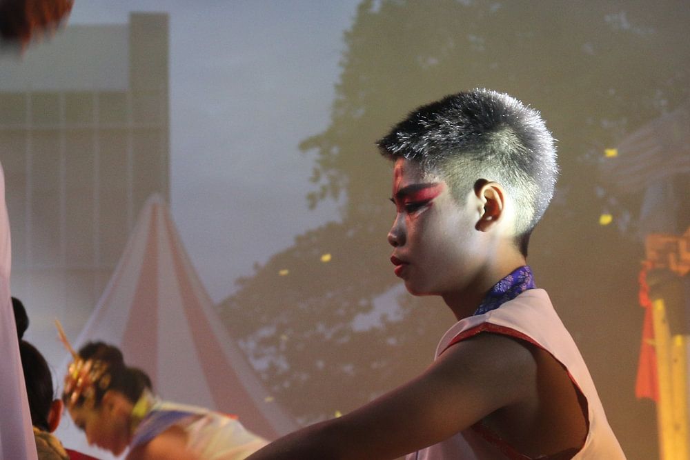 Jeune batteur lors d'un festival culturel à George Town, Penang, Malaisie, le 2 février 2020, dans une atmosphère brumeuse.