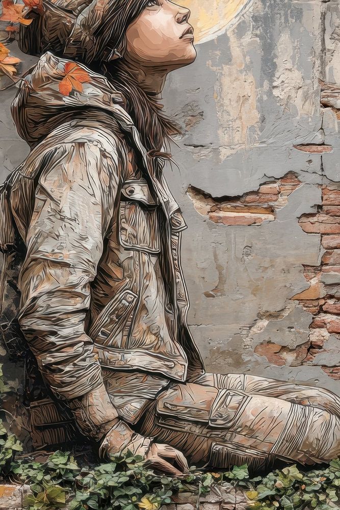 Mots-clés : peinture street art, décoration murale graffiti, art urbain, décoration murale colorée, BowiScapes, art expressif, jeune femme, méditation, rêve, lune, automne, mur dégradé, Wabi-Sabi, Eclectique, Industriel, Romantique, cage d'escalier, bureau, chambre, salle de pratique
