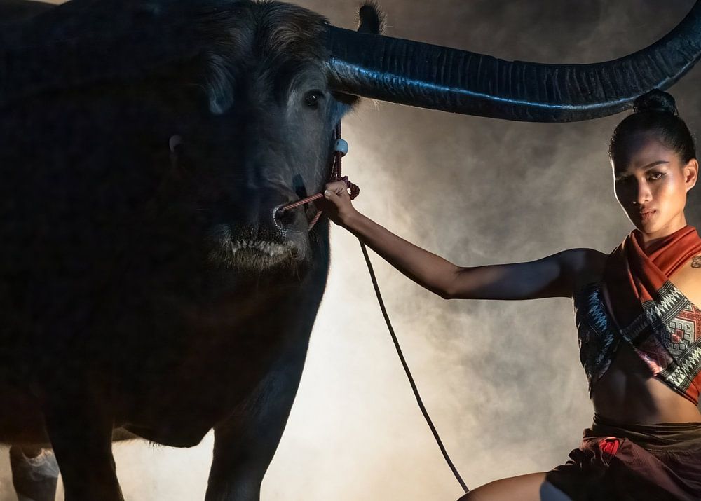 Une jeune femme thaïlandaise habillée en tenue traditionnelle devant un guerrier dans l'obscurité avec un buffle d'eau longhorn. Ces buffles d'eau sont très rares de nos jours.