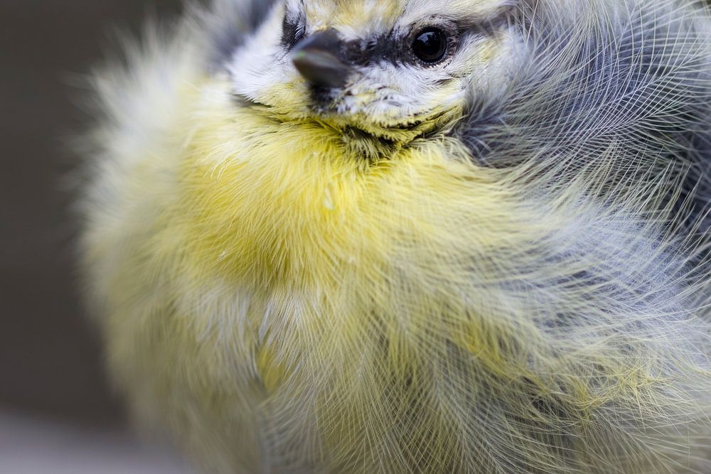 Une mésange bleue juvénile est assise sur le bord d'un abreuvoir dans le jardin. La petite boule duveteuse s'est laissée photographier tranquillement par un dimanche après-midi ensoleillé.