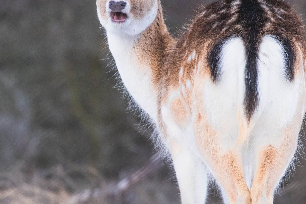 Des daims dans les dunes de l'approvisionnement en eau d'Amsterdam. Dans la neige, l'hiver 2021. Magnifique région de dunes blanches.