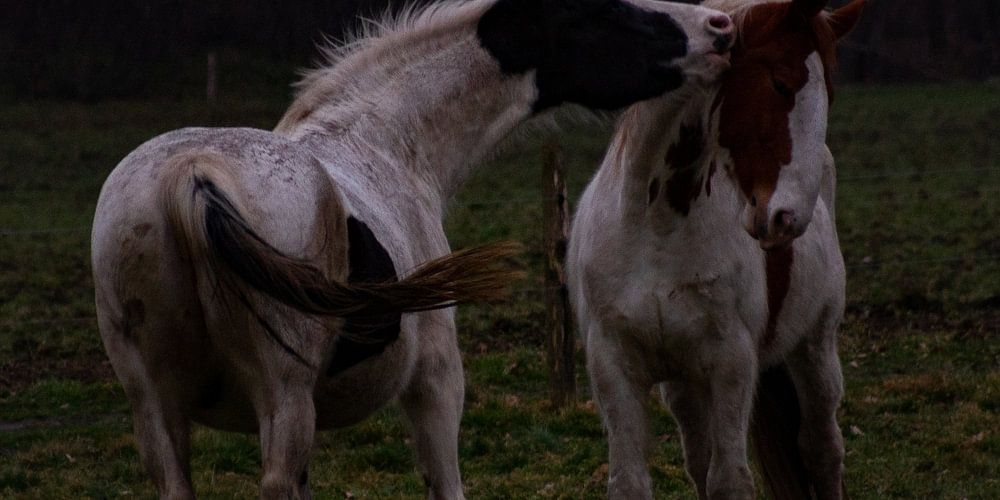 Un couple de chevaux jouant dans le pré, je me demande ce qu'ils se disent.