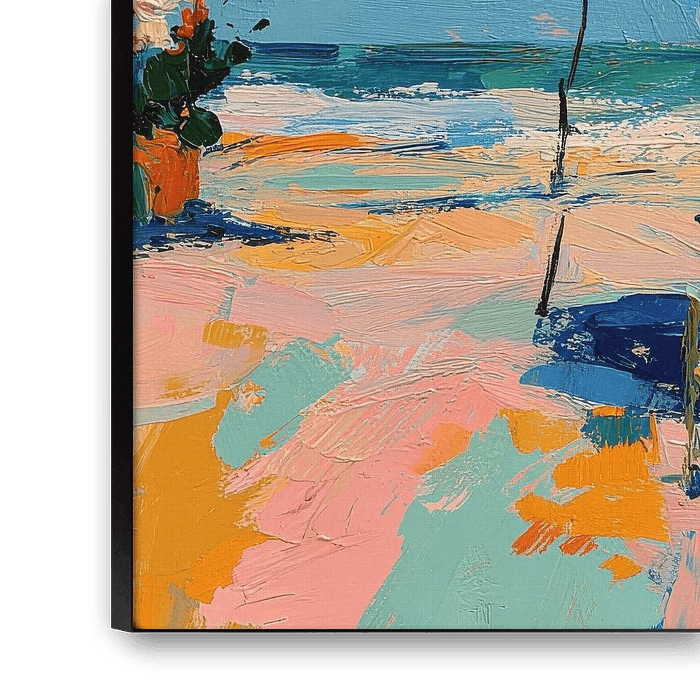 Une peinture impressionniste vivante montre une journée ensoleillée à la plage. Au centre, un grand parasol à rayures jaunes et oranges projette son ombre sur le sable chaud. À gauche, un palmier vert se dresse dans le tableau, derrière lequel s'étend une eau calme dans des tons bleus et turquoise. À droite se trouve une chaise en bois bleu clair, à côté de pots de fleurs colorés en orange, rose et blanc. Les coups de pinceau vifs et visibles donnent de la texture et du mouvement, tandis que les couleurs vives dégagent de l'énergie et une atmosphère estivale. La composition semble harmonieuse et capture l'atmosphère détendue et vivante d'une journée radieuse à la plage dans un style expressif et impressionniste.