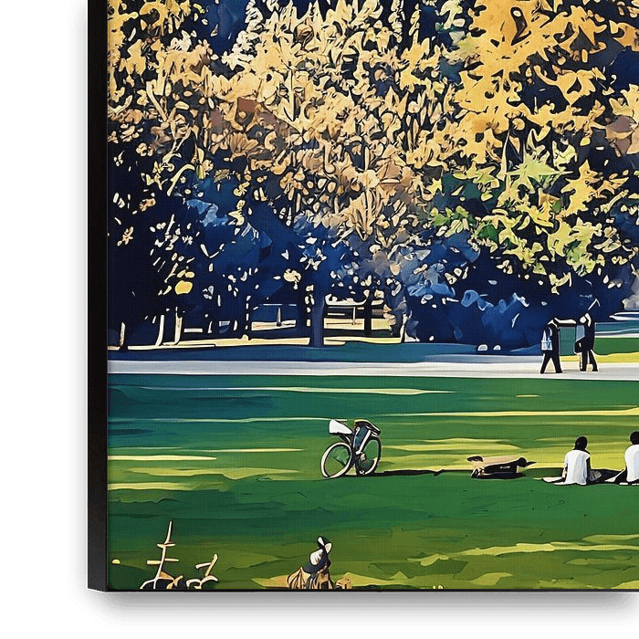 Cette scène dynamique montre des personnes profitant d'une journée ensoleillée dans un parc luxuriant avec des arbres aux couleurs automnales et un bâtiment historique à l'arrière-plan. L'image évoque une atmosphère animée et détendue, mettant en valeur un mélange de nature, de loisirs et de beauté architecturale.
