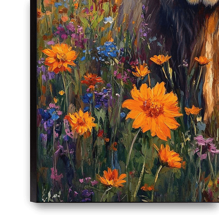Achetez cette œuvre d'art de paysage Joyeux Highlander dans le pré fleuri par But First Framing sur toile, aluminium, ArtFrame ou photographie (encadrée), impression d'art en haute qualité et tout format.