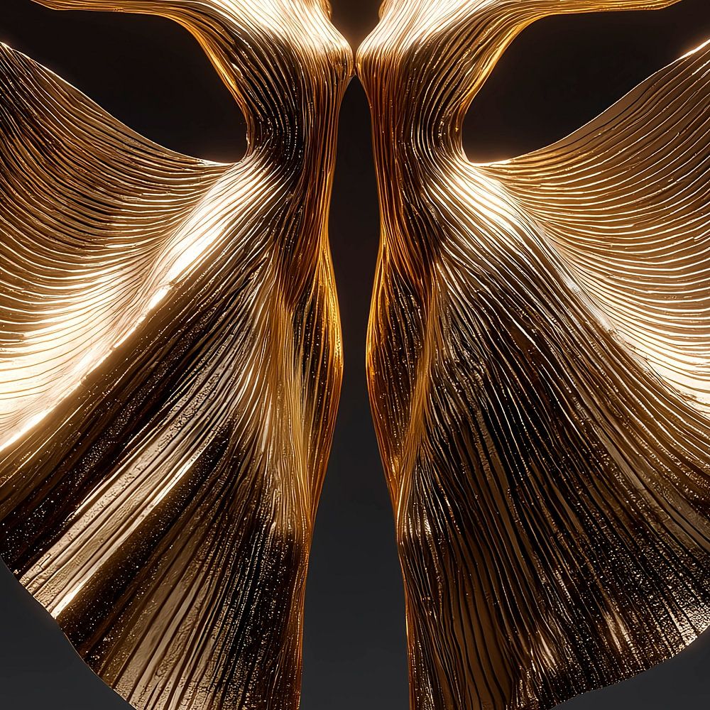 Une image élégante de deux figures féminines dorées stylisées avec des jupes larges et pimpantes qui s'évasent de façon spectaculaire. L'éclairage met en valeur les courbes et les textures des femmes grâce à une douce lueur et à des reflets qui rehaussent leur éclat doré. L'image dégage un sentiment de sérénité et de connexion.