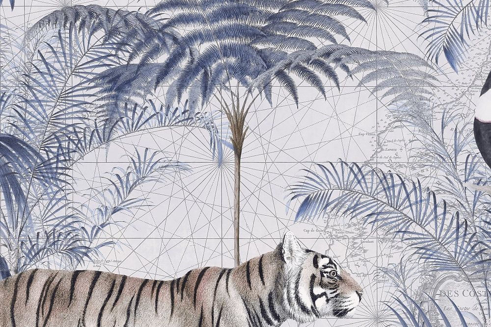 Tigre et toucan avec végétation tropicale et carte historique aux couleurs bleues, idéal pour les amoureux de la nature, les aventuriers, les voyageurs et les explorateurs