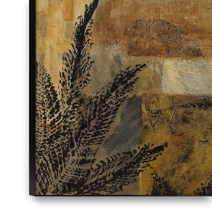 Une œuvre carrée réalisée à l'acrylique sur toile. Ce n'est pas habituel pour moi : pour une fois, pas de couleurs trop vives, mais des tons terreux et beiges avec un relief de palmier en noir. Il s'agit de deux toiles équivalentes, mais pas identiques, plutôt comme des sœurs.