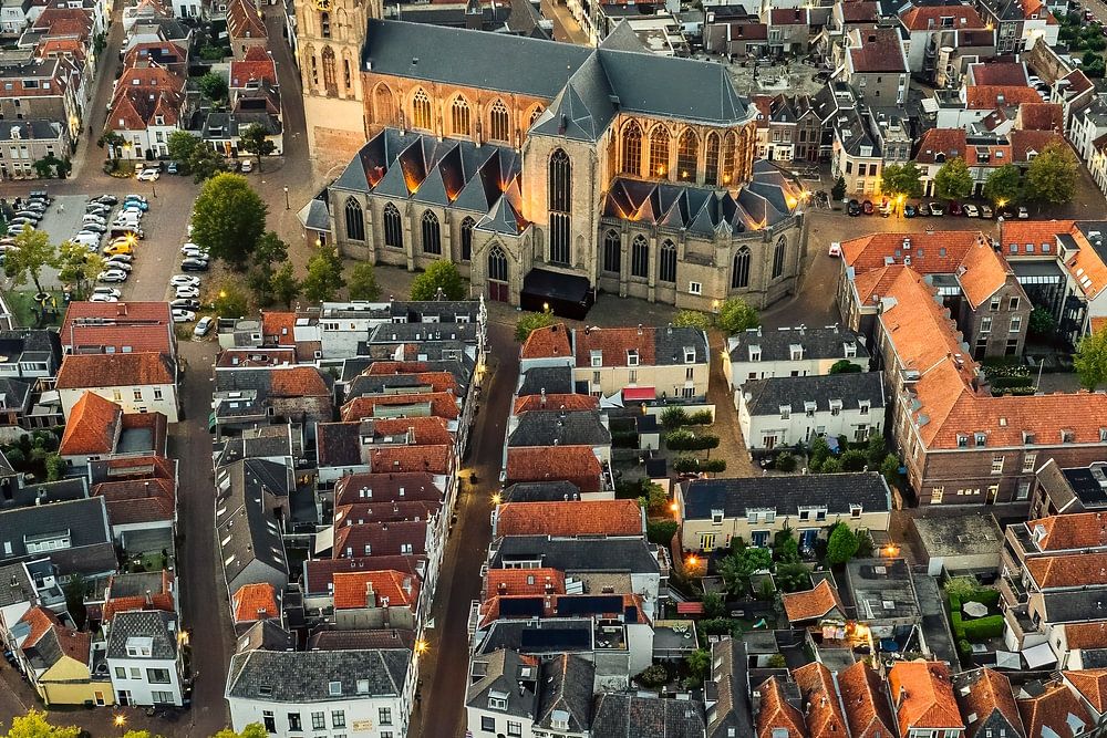 Vue aérienne de la ville de Kampen lors d'une soirée d'été, la lumière du soleil touchant les toits de l'ancienne ville de la Ligue hanséatique sur les rives de l'IJssel à Overijssel, aux Pays-Bas.