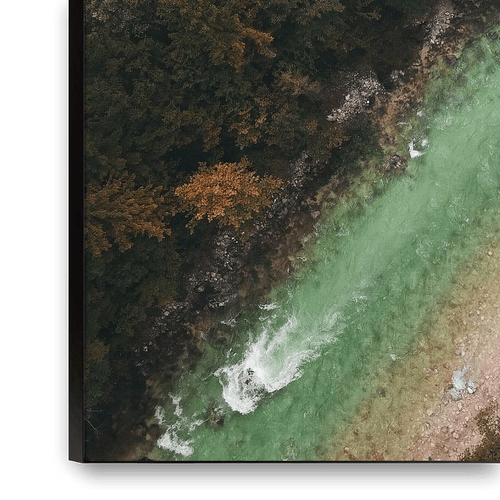 La rivière slovène Soča fait partie de ces endroits qui ne cessent de vous étonner, quel que soit le nombre de fois où vous vous y rendez. Depuis les airs, on peut vraiment voir à quel point cette couleur est spéciale - cette eau claire, presque vert émeraude, qui serpente comme un ruban à travers le paysage montagneux accidenté. Sur cette photo, vous pouvez voir trois kayakistes se déplaçant calmement dans le courant, leurs embarcations aux couleurs vives - rouge, jaune et bleu - contrastant agréablement avec le vert tendre de la rivière et les teintes chaudes de la forêt environnante.