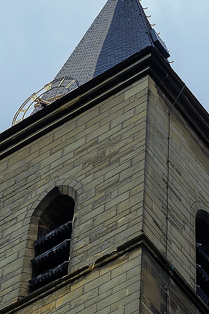 De kerktoren van de kerk te Schinnen gezien vanuit de zuidelijke richting.