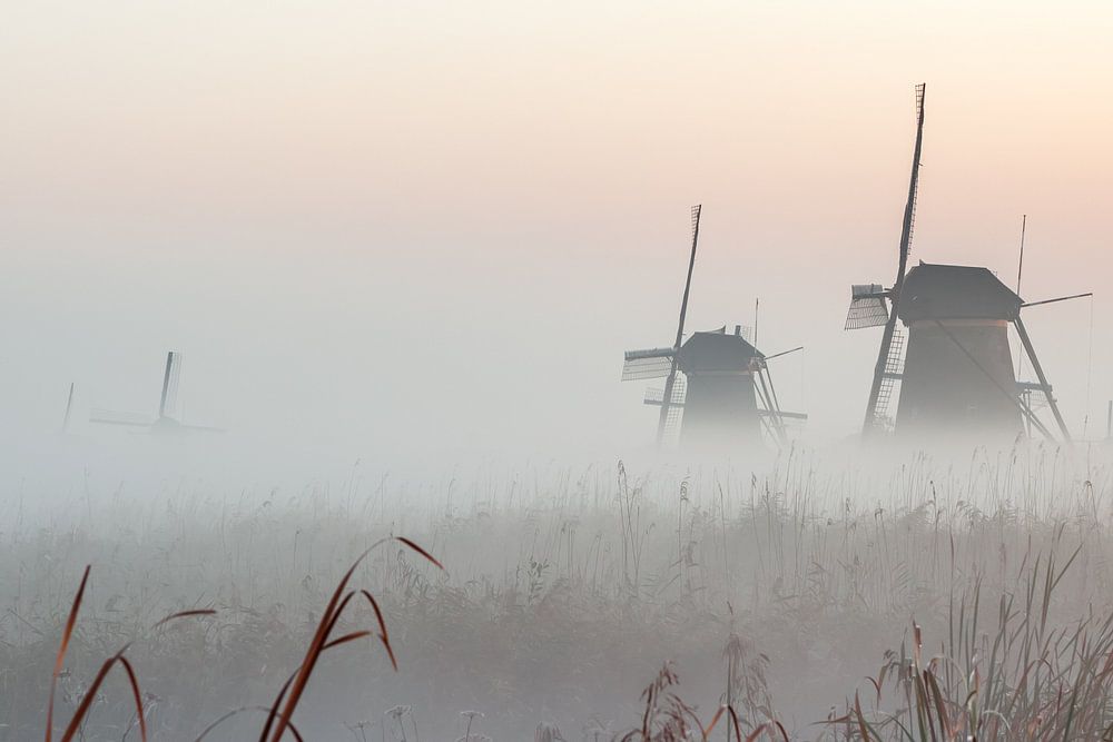 mist met op komende zon naast de molens van Kinderdijk in Holland